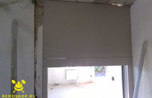 На получившуюся конструкцию сверху саморезами крепим гипсокартон, отпиленный по размеру, по бокам монтируются вертикальные полосы, для которых можно использовать отходы. При нехватке материала для верхней части можно использовать узкий фрагмент под потолком или непосредственно над проемом.