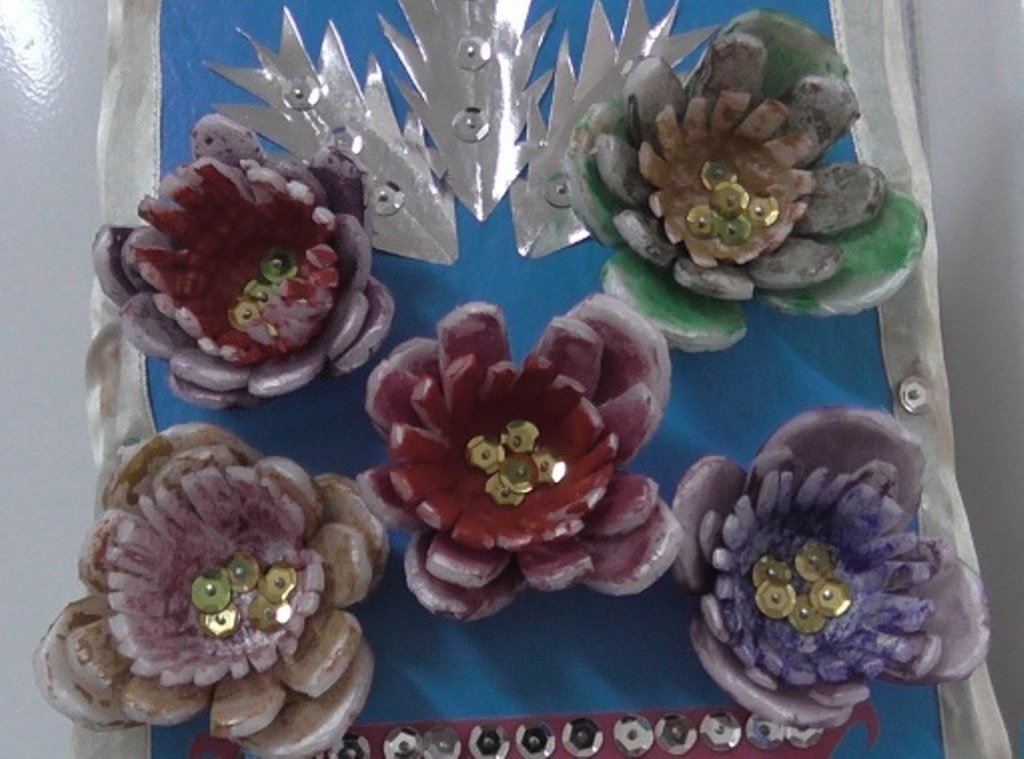 Для создания картины изготовьте цветы из скорлупок. Проклеивайте их нижнюю сторону. С каждым разом бутоны делайте больше в объёме. Разукрасьте получившиеся цветочки красками. Для этого подойдёт краска с акриловой основой или аэрозоль. В случае использования акрила, разводите такую краску водичкой в какой-нибудь мисочке или тарелке. Помещайте туда цветы на несколько минут и вынимайте уже окрашенные.