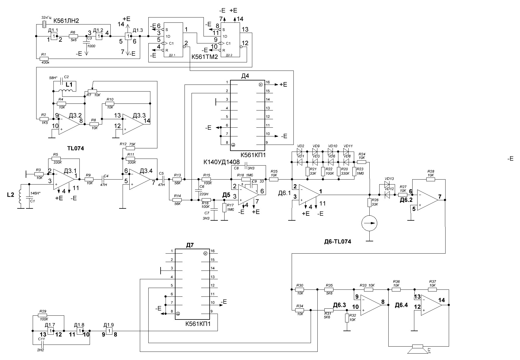 Технология работы аппарата – импульсная. Это позволяет обеспечить очень хорошие для такого класса аппаратуры показатели чувствительности. Ниже представлена схема электронного блока на микросхемах.