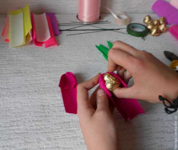 Сначала нужно подготовить бутоны цветов. Для этого разрезать заборчиком гофрированную бумагу, размер её выбирать в зависимости от размера конфет. В заготовку закрутить конфету и закрепить снизу ленточкой, а лепесточки нужно немножко растянуть, придавая им при этом более естественную форму. Таким же способом изготавливаются цветы других окрасок. Только уже заготовку из бумаги можно сделать большего размера, а конфету перед этим нужно завернуть в фольгу в цвет бумаги. Бумажные заготовки немного растягиваются в центре каждого лепестка.