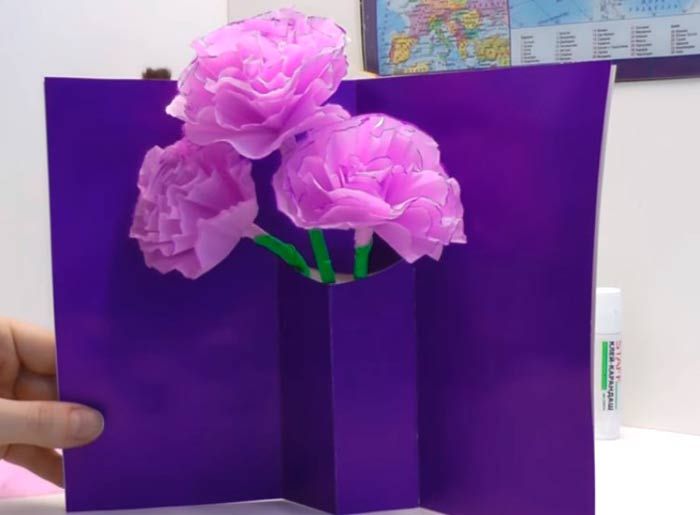 Особого внимания заслуживает открытка с объемными цветами своими руками, которую сделать немного сложнее, чем представленные выше варианты, но и выглядит она эффектнее. Над такой работой может трудиться учащийся младшей школы, а родители, как всегда, придут ему на помощь.