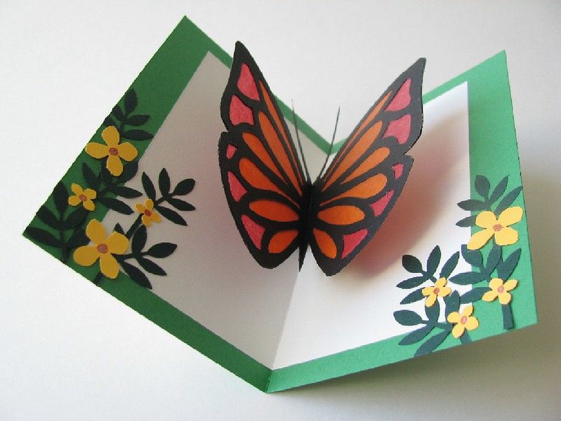 Приклеить к вырезанным ладошкам посередине сначала большую бабочку, потом ту, что поменьше, потом туловище. Бабочка должна получиться объемной. Написать поздравление.