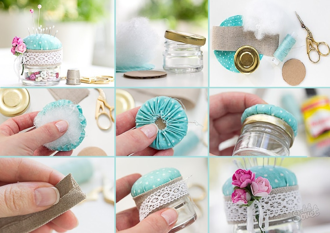 Экспериментируйте и пробуйте украшать любые емкость бусинами, пуговицами, бисером, стеклярусом, паетками, мешковиной и всем тем, что завалялось дома!