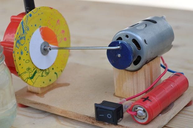 Приводить во вращение крыльчатку будет двигатель. Вынут был, скорее всего, из какой-то игрушки. Параметров его не знаю, поэтому напряжение больше 5 В не поднимал. Главное чтобы двигатель был «пошустрее».