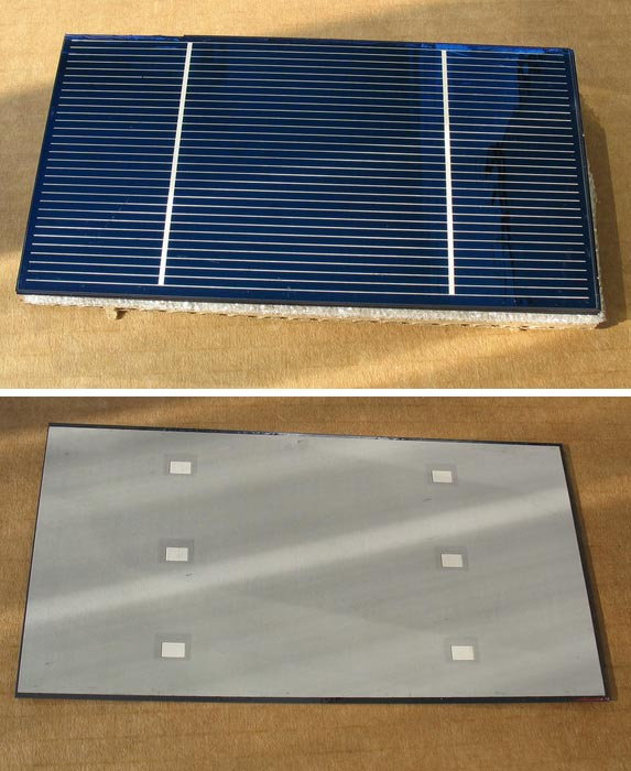 Элементы на поли- или монокристаллическом кремнии необходимо объединить в единую панель. Для этого осуществляется пайка контактов к проводникам. Порядок пайки следующий: