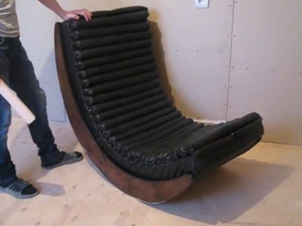 Кресло-качалка, выполненное из полипропиленовых труб выглядит довольно креативно, но не подходит для домашнего использования. Так как материал отличается повышенной устойчивостью по отношению к погодным условиям, его можно эксплуатировать на улице, убирая в помещение на время морозов и пряча от прямых солнечных лучей. Отдельные части конструкции собираются при помощи паяльника. Чем большее количество соединительных элементов используется, тем более устойчивым окажется кресло.