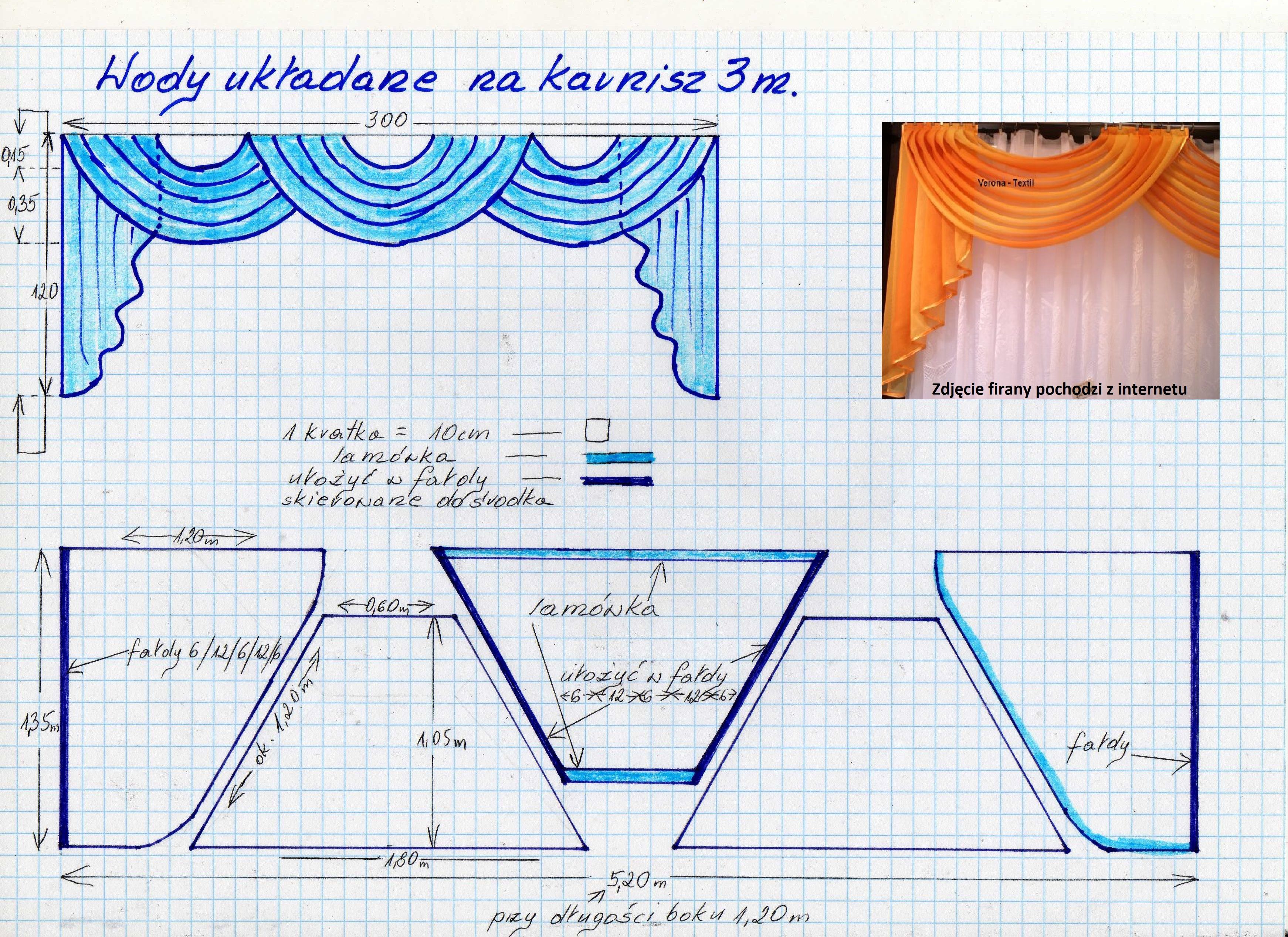 Длина определяется с учетом выбранной модели изделия, радиуса карниза, желаемого расстояния до карниза и припусков на пришивание.