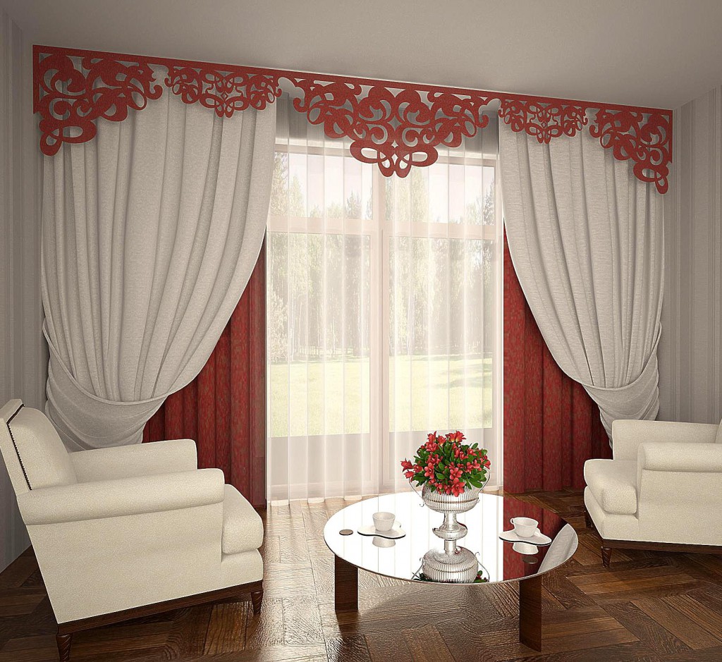 Тюль с ламбрекенами (фото зала см. Ниже) может быть любого цвета. Его выбирают в зависимости от масштаба, использованного для оформления этого помещения в целом.