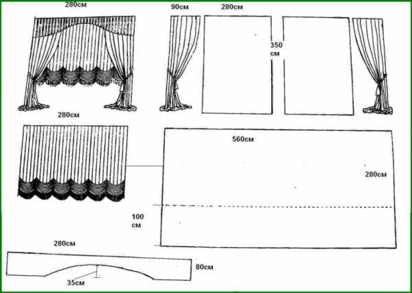 Ширина ткани равна ширине карниза, к которой следует прибавить около 4 см для свободного расположения. Для выкройки со складками, производятся те же измерения, а затем умножаются на 2. К длине обычно требуется прибавить дополнительных 8-16 см в зависимости от материала.