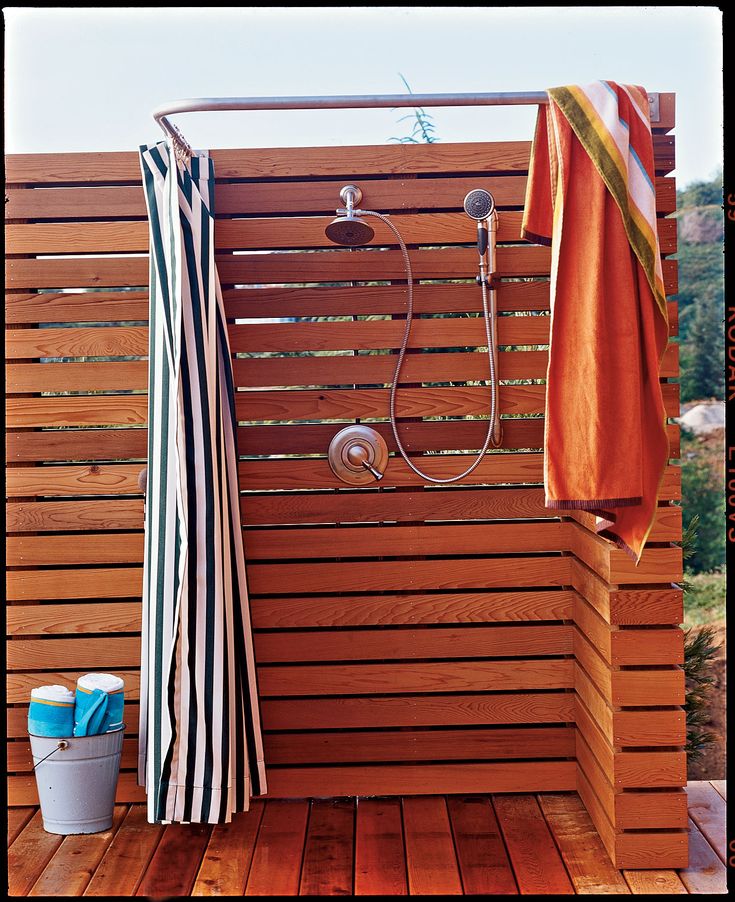 Преимущество строительства уличного душа сбоку от дома заключается в том, что у вас уже есть источник горячей воды, к которому вы можете подключиться в доме.