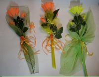 Берем второй кусок органзы, заворачиваем в нее букет. Подвернуть его в месте соединения (шва) на 4-5 см. Приклейте его небольшой каплей клея у самого края.